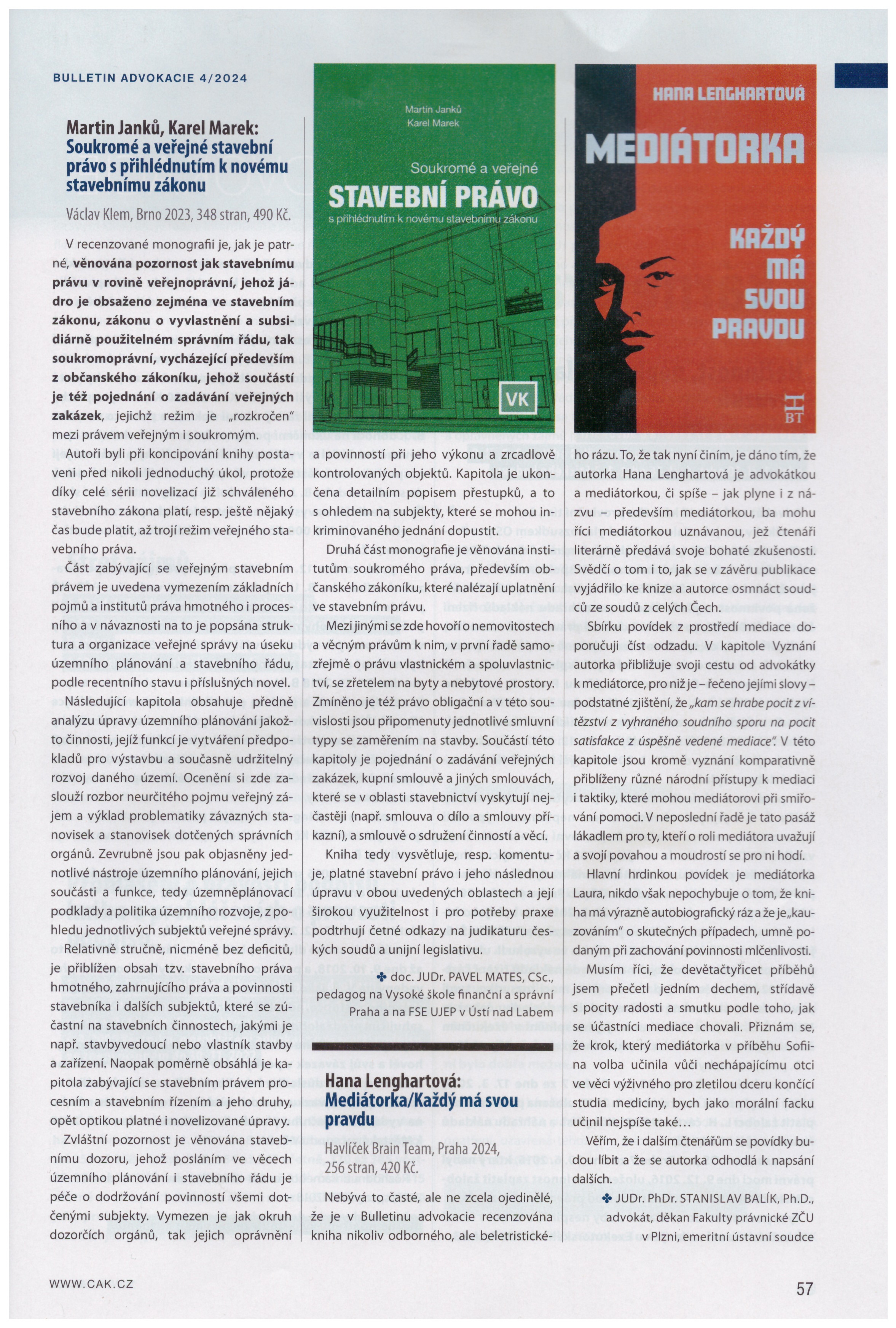 Výhradně u nás můžete zakoupit knihu, ve které se autoři – doc. Martin Janků a prof. Karel Marek – zabývají aktuálním tématem – soukromým a veřejným stavebním právem, mj. v souvislosti s novým stavebním zákonem. Jak jejich počin hodnotí odborná veřejnost si můžete přečíst v recenzi doc. Pavla Matese v dubnovém čísle Bulletinu advokacie, resp. online v Advokátním deníku.