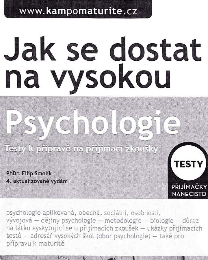 psychologie aplikovaná, obecná, sociální, osobnosti, vývojová, dějiny psychologie, metodologie, biologie, důraz na látku vyskytující se u přijímacích zkoušek, ukázky přijímacích testů, adresář vysokých škol (obor psychologie), vhodné pro přípravu k maturitě.